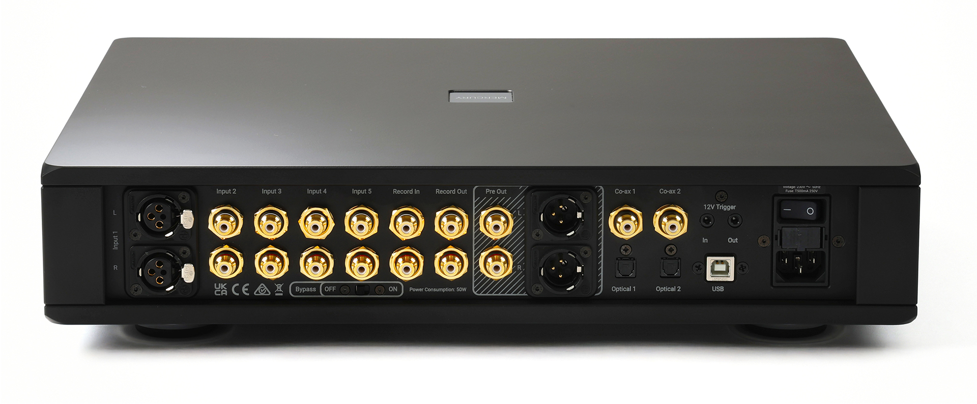 Around back of the Mercury is a set of balanced XLR inputs, four more RCA inputs, and a set of tape in and tape out jacks. There are balanced XLR and RCA outputs. The built in DAC offers two coaxial inputs, two optical/toslink SPDIF inputs and a galvanically isolated asynchronous USB input. Personally, and selfishly, I like the tape loop, but most of you will never need it. The Mercury amplifier is stark, with a single pair of RCA inputs, a pair of XLRs. I love it that they rate the amplifier at 168 watts per channel into 8 ohms and 304 into 4. No rounding up. That wouldn’t be Rega.